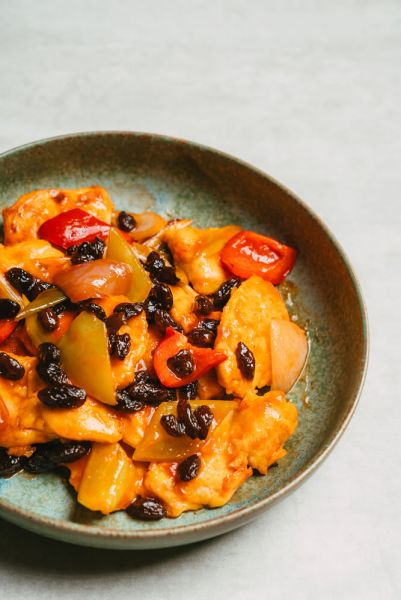 - 將洋蔥片、青蔥、甜椒放入鍋中炒香後、加入糖醋醬煮滾後加入雞肉片、加入30g加州葡萄乾,攪拌均勻後即可